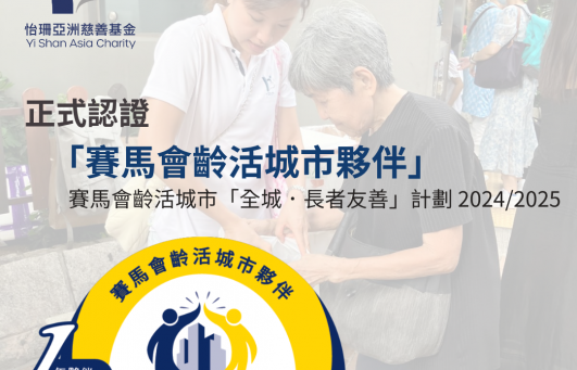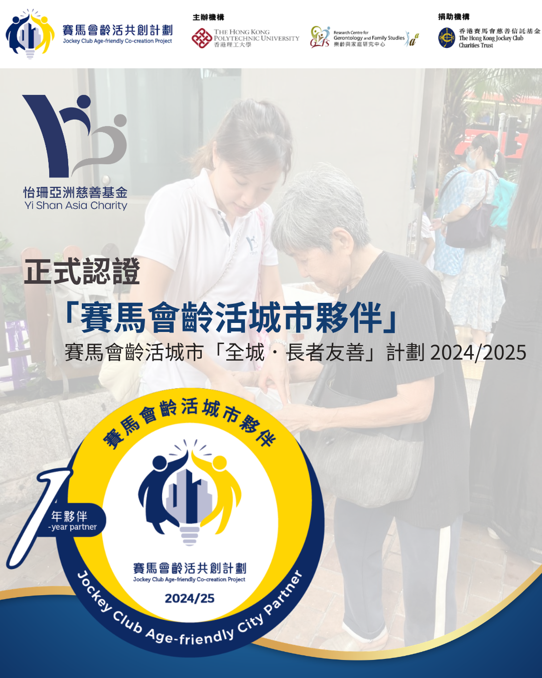 Yi Shan Asia Charity is honored to announce that we have been awarded the 2024/25 "Jockey Club Age-friendly City Project" Sticker under the "Jockey Club Age-friendly City Partnership Scheme". This recognition is a testament to our dedicated efforts over the past year in promoting age-friendly communities. It further fuels our commitment to implementing age-friendly measures and providing specialized social services tailored to the needs of our elderly.